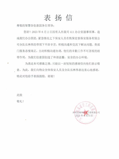 深圳市城市建安工程有限公司致信表揚我司鐵保宏泰深圳保安公司安保隊長林偉同志工作服務態度端正,辛勤工作,為園區創造了和諧溫馨安全的辦公環境,特致信表示感謝。