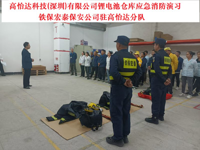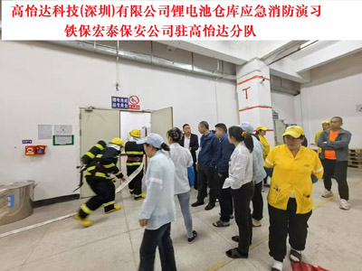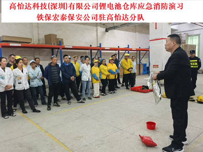2024年11月28日高怡達科技(深圳)有限公司鋰電池倉庫應急消防演習 ,鐵保宏泰保安服務公司駐高怡達分隊。高怡達科技(深圳)有限公司成立于2004年11月05日,注冊地位于深圳市龍崗區橫崗街道六約金塘工業區勤富路30號B、C棟,法定代表人為林尤澳。經營范圍包括無。^生產經營各款電源供應器、變壓器、馬達組件、電源插頭、線圈、電源組件、插頭電源線、穩壓電源、紫外光牙刷頭消毒器、LED燈板、牙刷玻璃杯、機器人、自動化設備、機械及機電設備、制造管理信息化系統。上述產品的研發設計與技術服務。